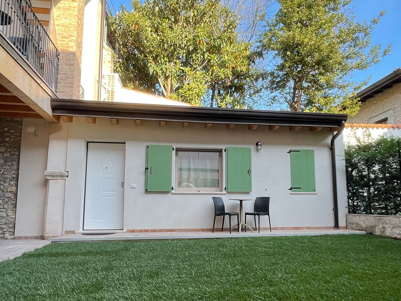 Zimmer mit Doppelbett von 12,80 m² und eigenem Bad von 5,50 m², im Erdgeschoss mit Blick auf den Garten.