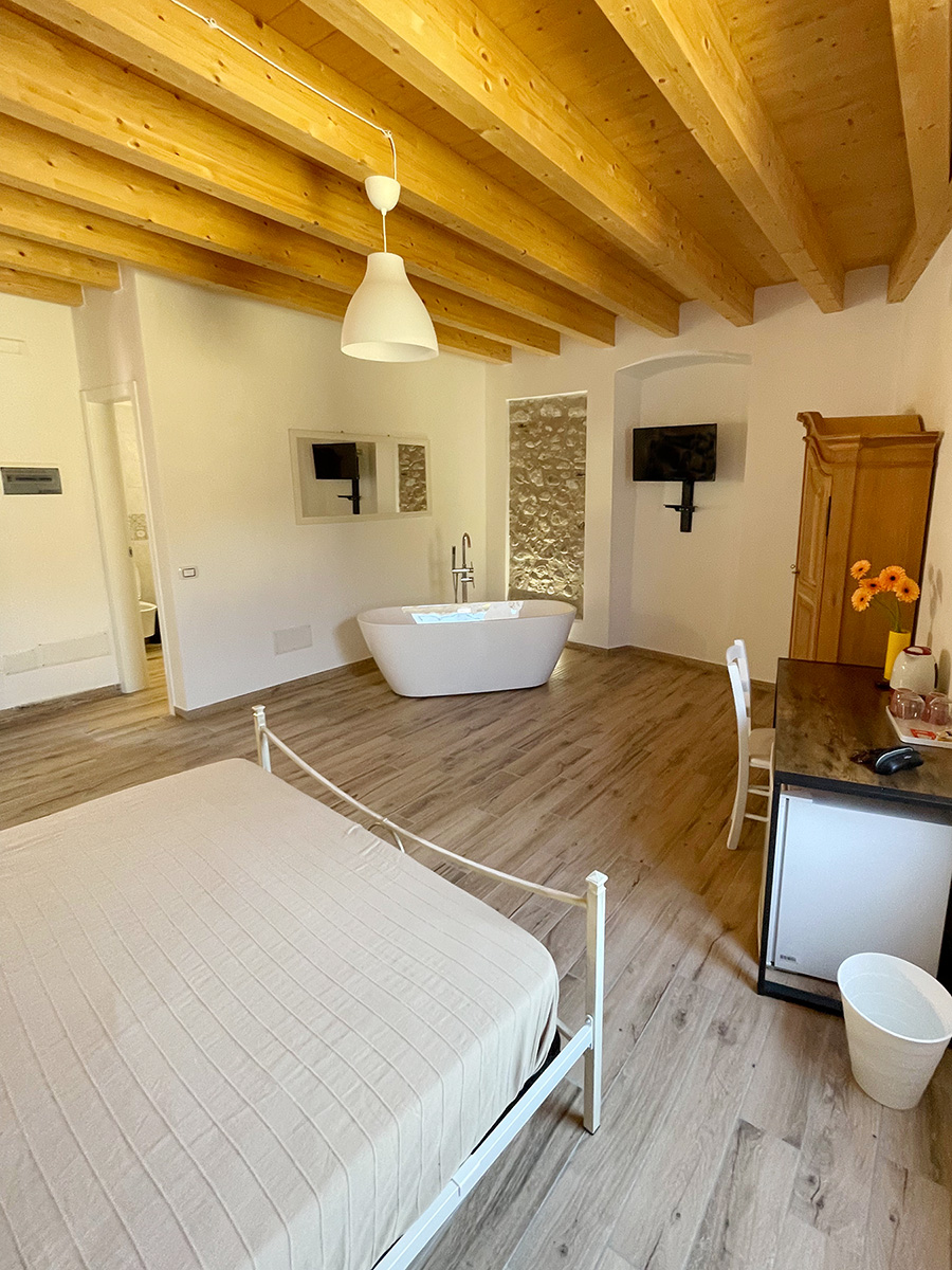 Zimmer mit Doppelbett von 24 m2 und eigenem Bad von 7 m2, im ersten Stock gelegen.
