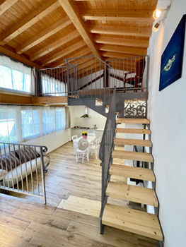 Apartment bestehend aus einem 12 m² großen Doppelzimmer im Zwischengeschoss, einem 7,5 m² großen Badezimmer und einer 21 m² großen Wohnküche im ersten Stock.