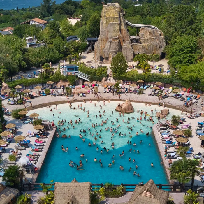 Der größte Vergnügungspark Italiens mit Blick auf den Gardasee.
