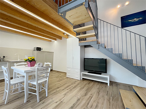 Appartamento composto da una camera matrimoniale di 12mq sul soppalco, un bagno da 7,5mq e cucina/soggiorno da 21mq, situato al primo piano.